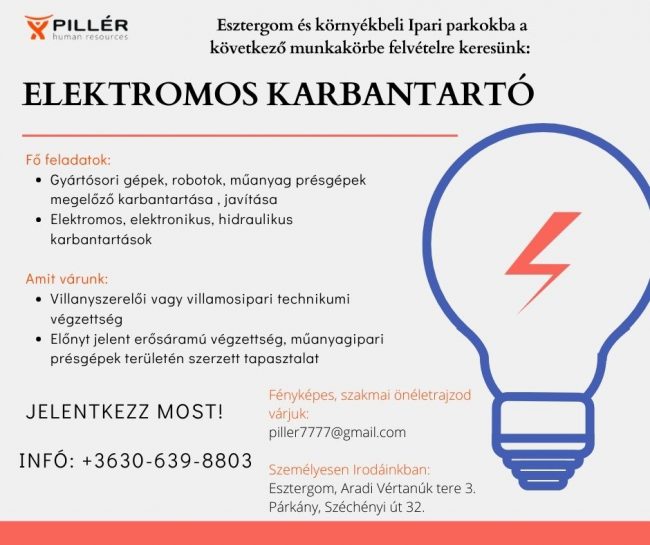 Esztergom és környékbeli ipari parkokba felvételre keresünk a következő pozícióba: ELEKTROMOS KARBANTARTÓ