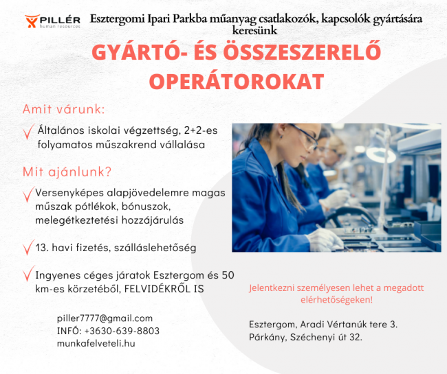Esztergom és környékbeli ipari parkokba felvételre keresünk a következő pozícióba: GYÁRTÓ-ÉS ÖSSZESZERELŐ OPERÁTOR